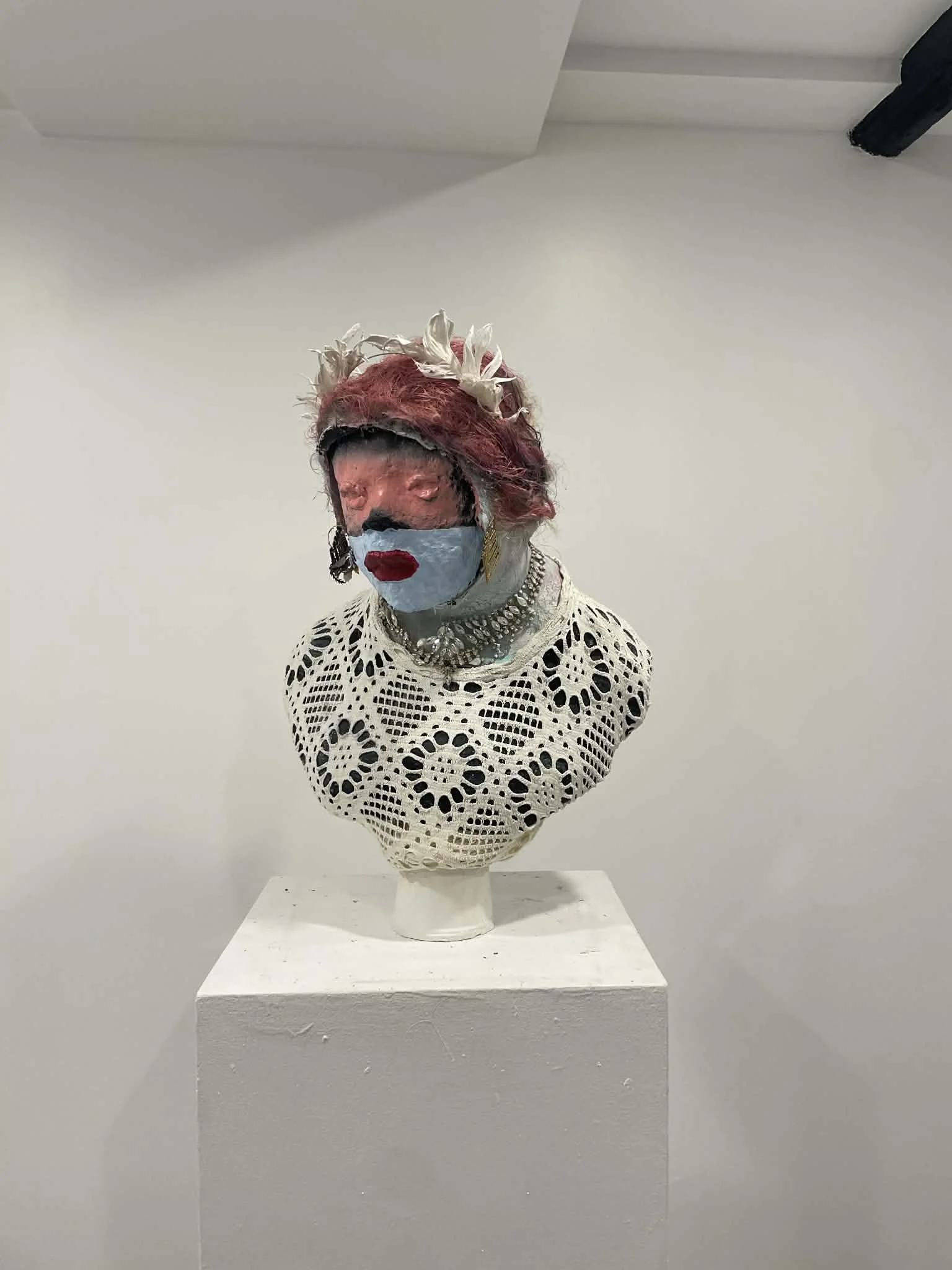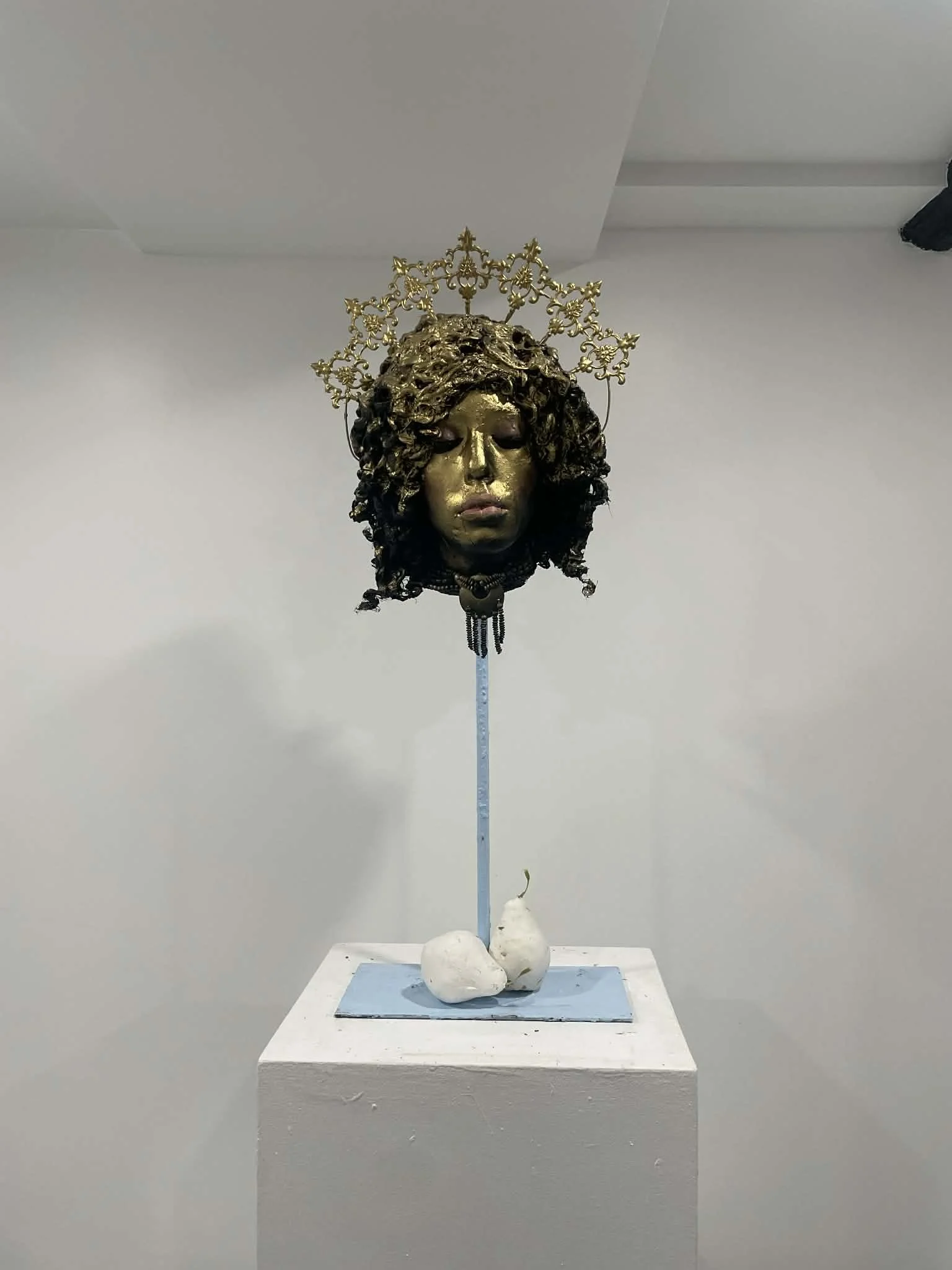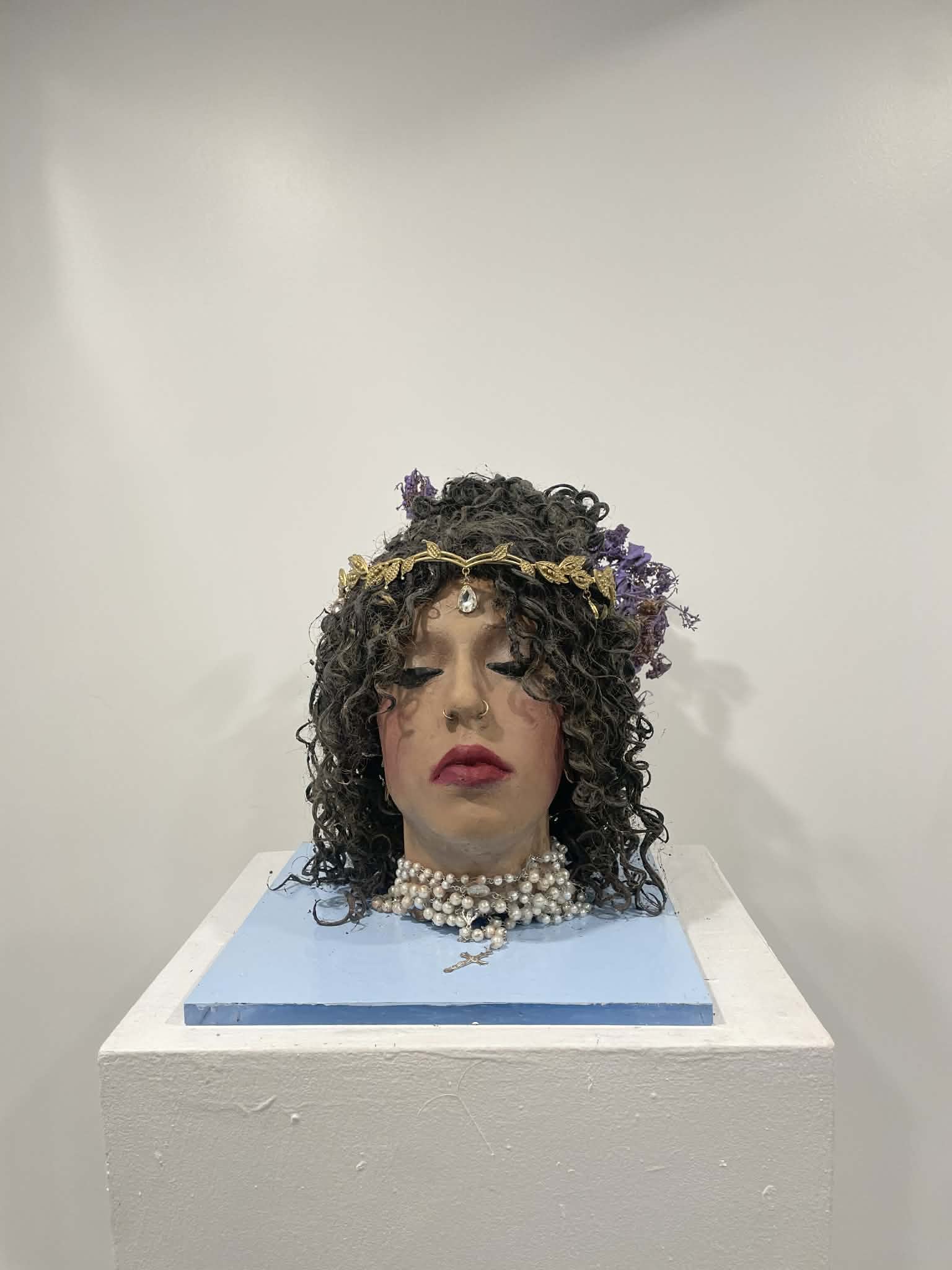 Le dernier printemps, cire, Lilas séchés, métal, Plexiglas, bijoux, chapelet, peinture, maquillage, 28'' x 20'' x 20'', 2025, Dans cette sculpture, la tête décapitée devient une icône tragique : une effigie suspendue entre beauté et disparition, entre désir et effacement. Le visage, fardé avec une intensité presque cérémonielle, porte la mémoire d’un amour queer et lesbien brisé par une société qui refuse les métamorphoses intimes. Les boucles sombres, alourdies par les fleurs séchées, semblent retenir les derniers souffles d’une passion interdite ; elles s’enroulent comme des racines déracinées, tentant encore de s’agripper à une terre qui ne veut plus d’elles. Le collier de perles, fragile armure de féminité, évoque à la fois le soin attentif d’une amante et le poids des normes qui étranglent. Ces perles deviennent des fragments d’un récit secret, déroulé à même la peau, un langage codé que seules celles qui ont aimé contre l’ordre social peuvent entendre. La tête repose sur un socle bleu, couleur de ciel inatteignable, horizon d’une liberté toujours promise mais sans cesse refusée. L’œuvre affirme que l’amour queer n’est pas seulement une identité, mais un acte de résistance. Elle expose la violence symbolique d’un monde où la différence est tolérée seulement lorsqu’elle se tait. En choisissant la frontalité — un visage qui nous regarde même les yeux clos — la sculpture impose sa présence, exigeant une réparation, une reconnaissance. Ici, l’impossible se matérialise : un amour décapité, mais non réduit au silence. L’œuvre devient monument d’un combat collectif, mémoire incarnée de celles qui aiment envers et contre tout. Elle oppose à l’oubli une beauté indocile, souveraine, et profondément politique.