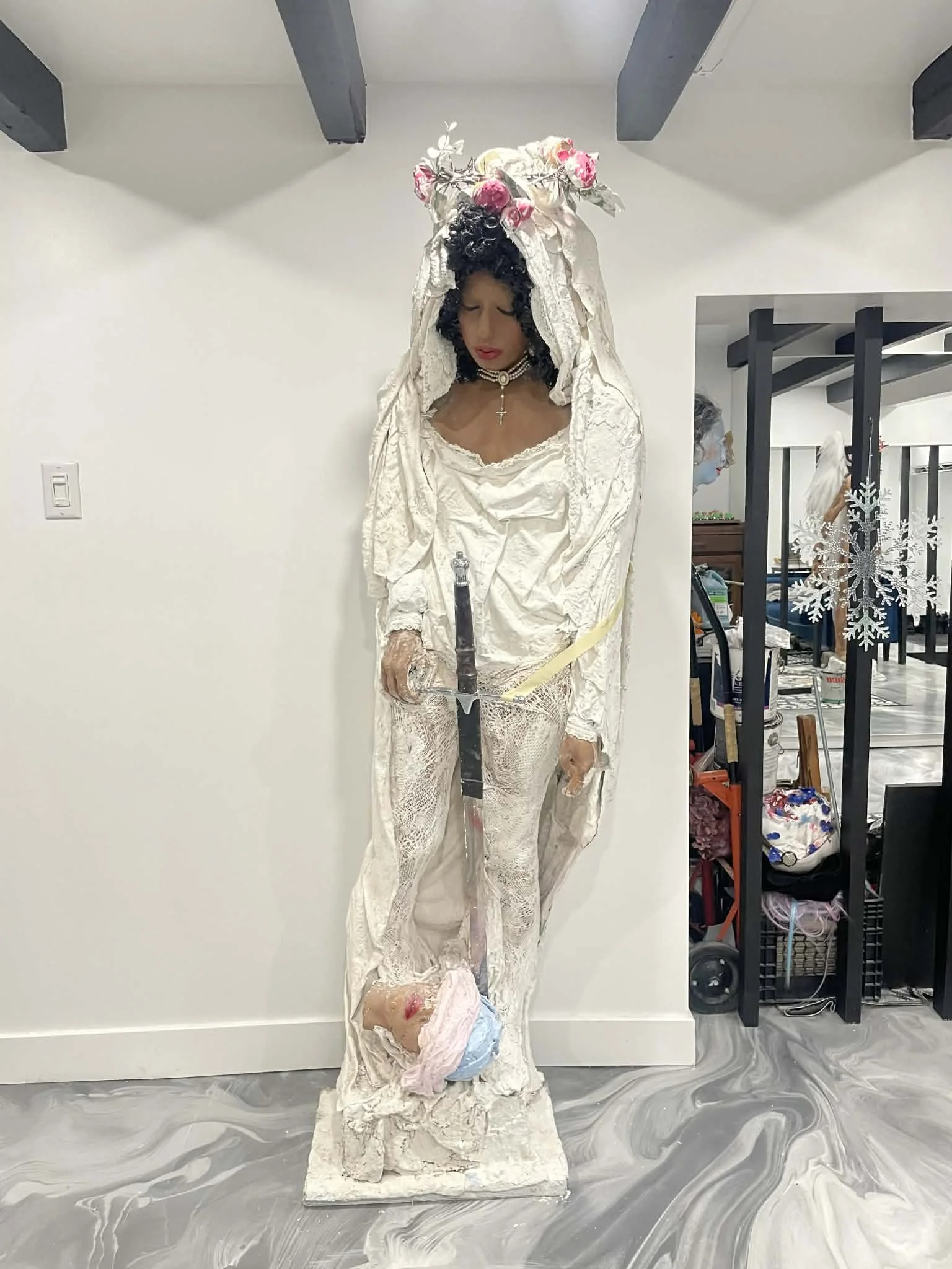Dans cette sculpture, la tête décapitée devient une icône tragique : une effigie suspendue entre beauté et disparition, ent